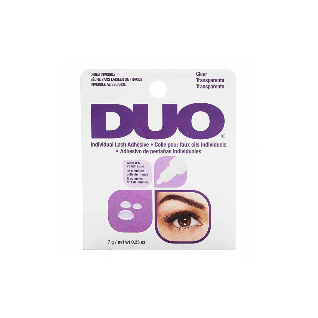DRIES CLEAR, INVISIBLE LASH ADHESIVE: DUO Brush-On Lash Adhesive Clear blends well with your eyelashes completing your eye makeup with a full lash look! Great when you are wearing little to no eyeshadow, eyeliner or are working with lighter lash shades. It dries clear to keep your eye makeup perfect all day without worrying about smudging, creasing, or having a white film on your eyelids. Want to keep your eyelash extensions natural yet glamorous-looking? Clear eyelash glue is the way to go!